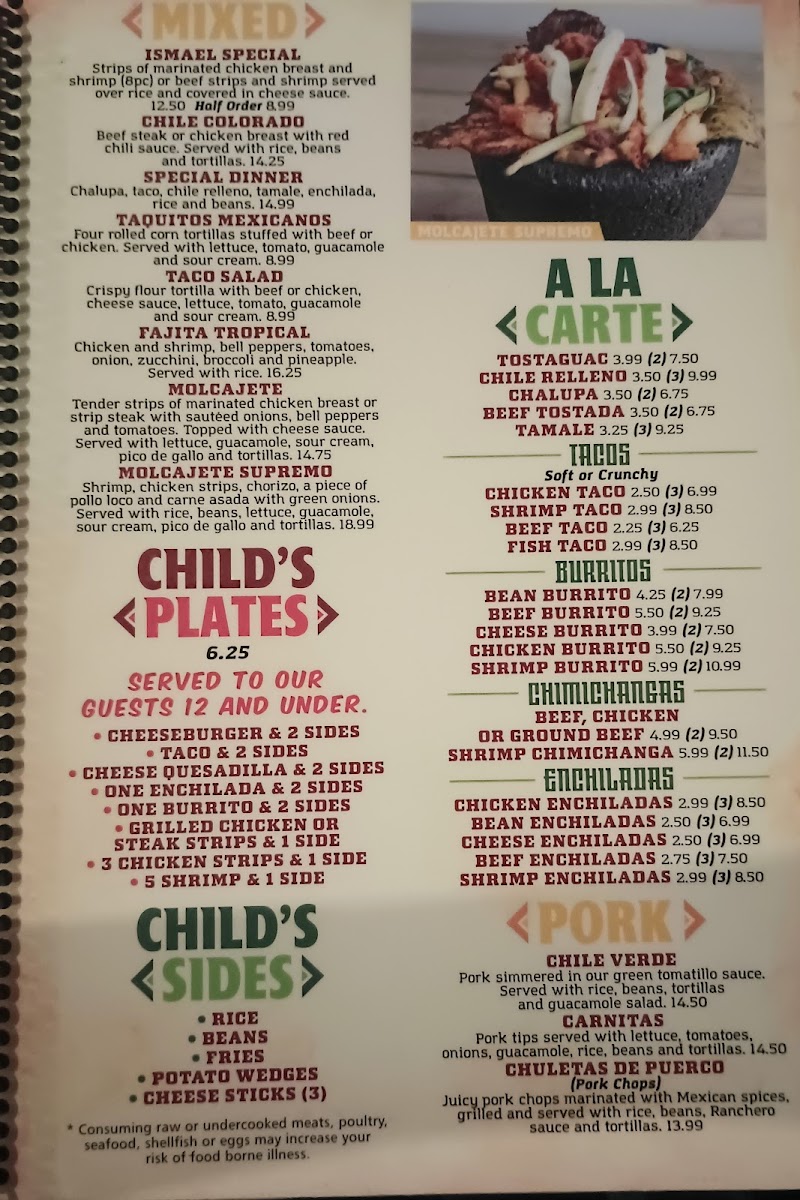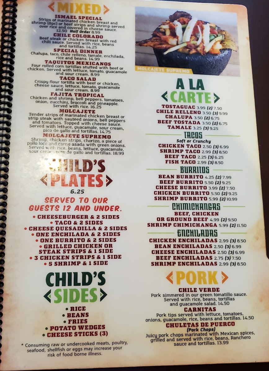 Shrimp chicken and steak topped with jalapeños, onions, tomatoes and mushrooms. Served with rice and beans.